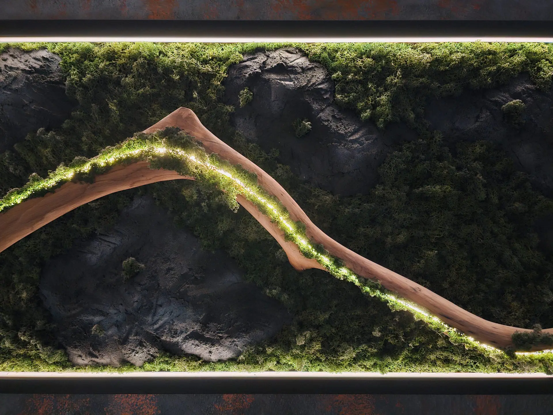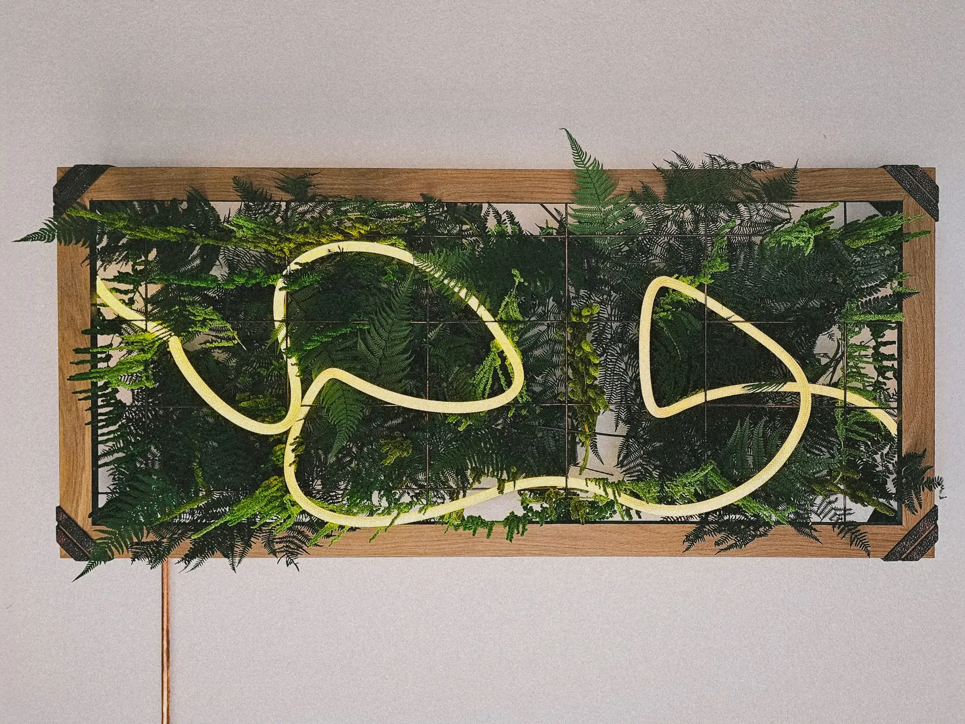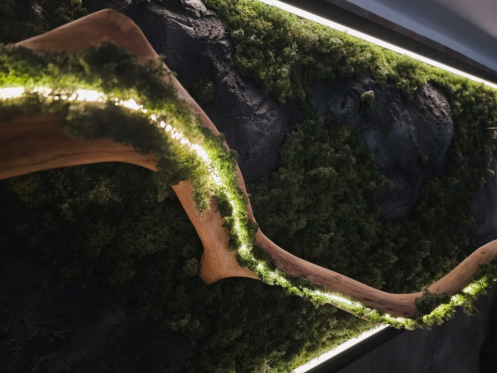 Ziel ist es, einen Ort der Ruhe zu schaffen – nicht draußen, sondern dort, wo wir täglich leben und arbeiten. Daraus entstanden unsere Wand- und Deckenpaneele aus hochwertigem Holz, konserviertem Moos und Farn. Ergänzt durch eine moderne, per Smartphone steuerbare LED-Beleuchtung verbinden sie natürliche Materialien mit zeitgemäßer Technologie.